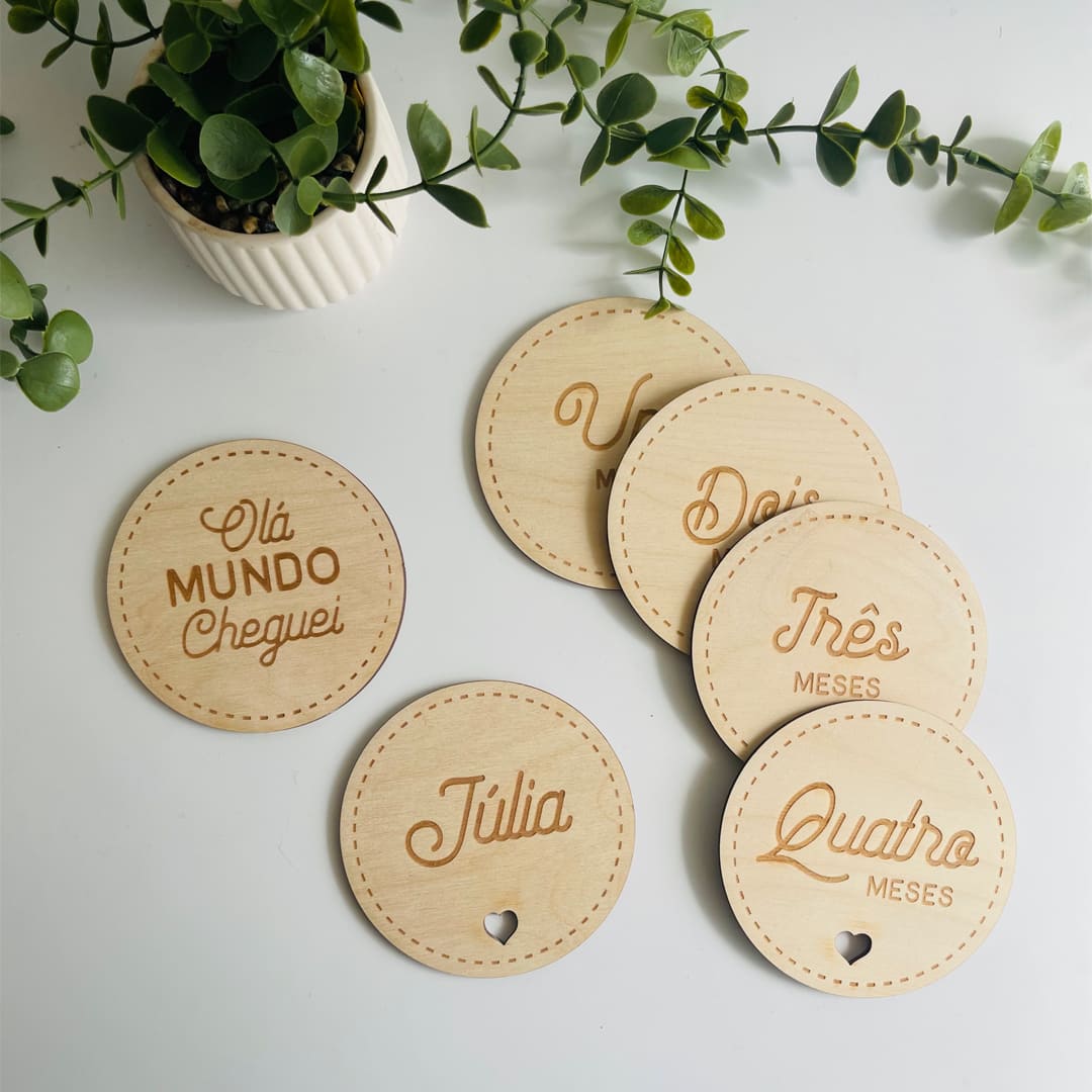 Composto: 12 placas mensais + 1 placa “Olá mundo cheguei” + 1 placa nome personalizado